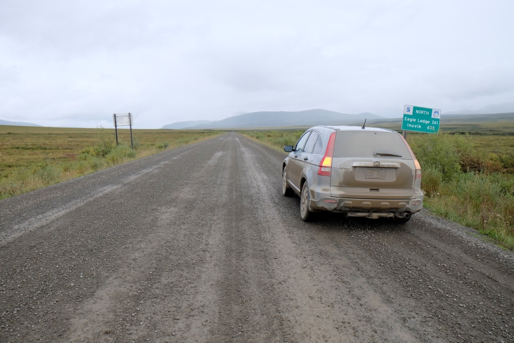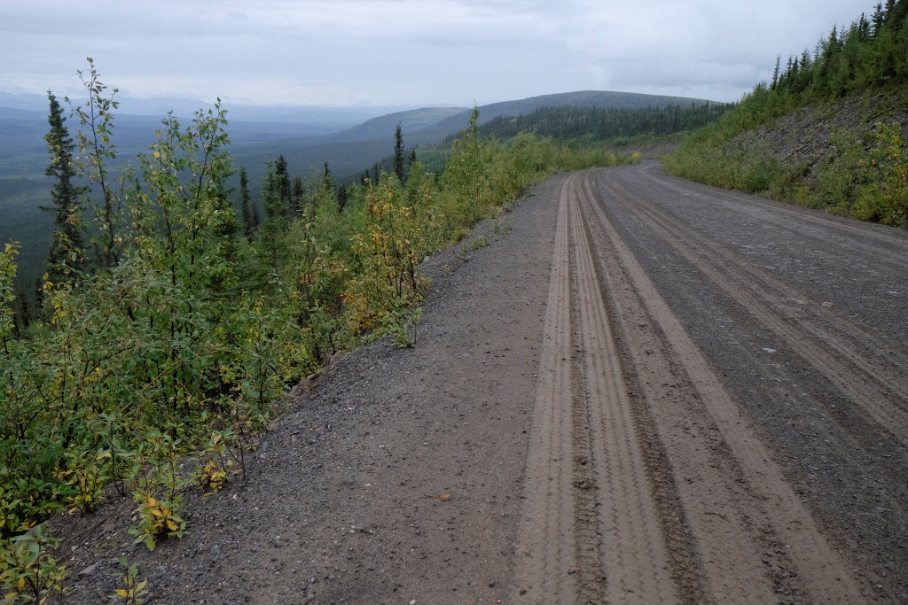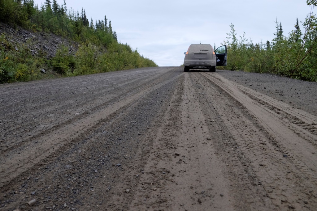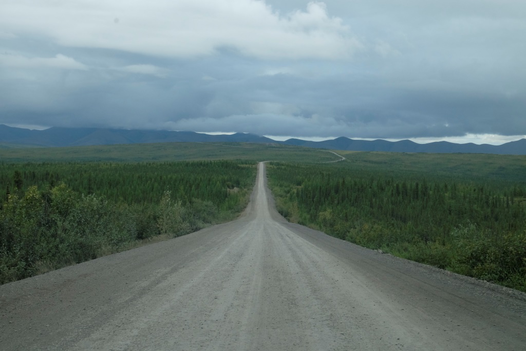 We take a small brake, just standing and looking at Dempster highway, 737 km of gravel. And then we say that.