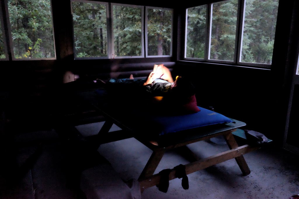After dinner we chat for a while with American couple who tell us some crazy bear stories (very appropriate in our situation) and we answer to their questions by most using phrases 8 and 9. Then they go back to sleep in their cozy and safe RV, but we pull out our sleeping bags and mattresses, and turn picnic tables into the beds for tonight. I load my bear banger, Raphael puts a bear spray next to him, we push tables closer to the heat source hoping to get some sleep and hoping to wake up next morning.