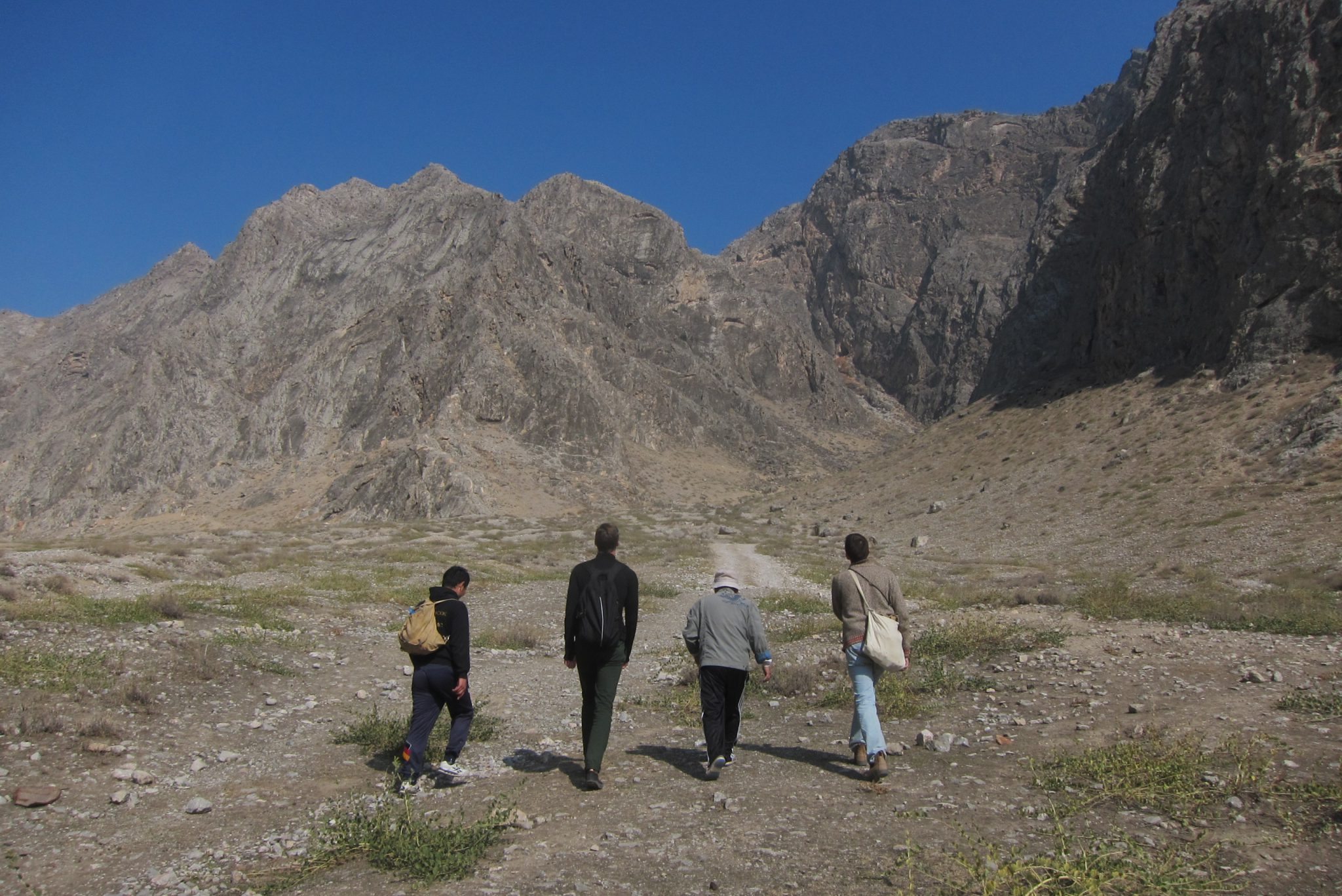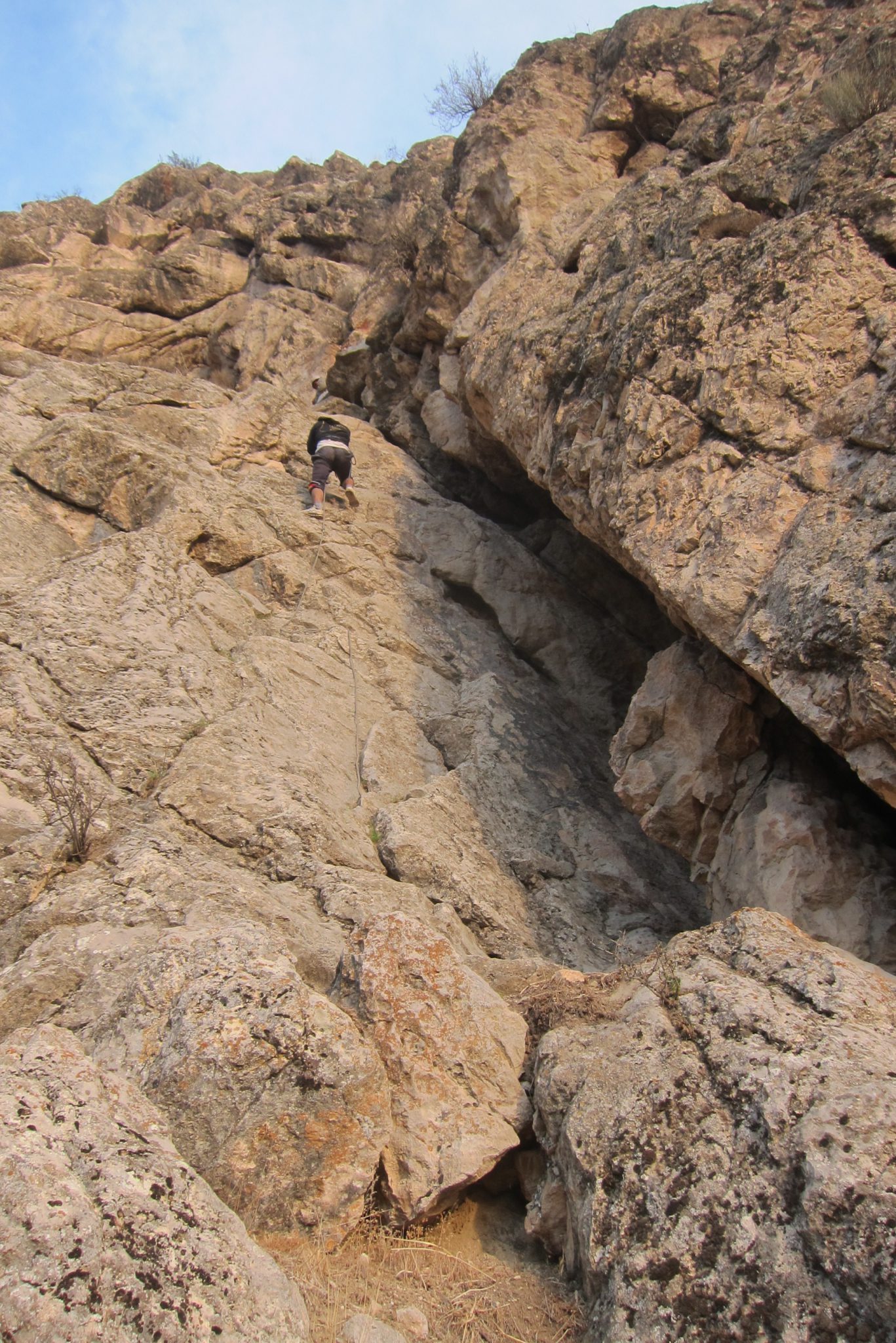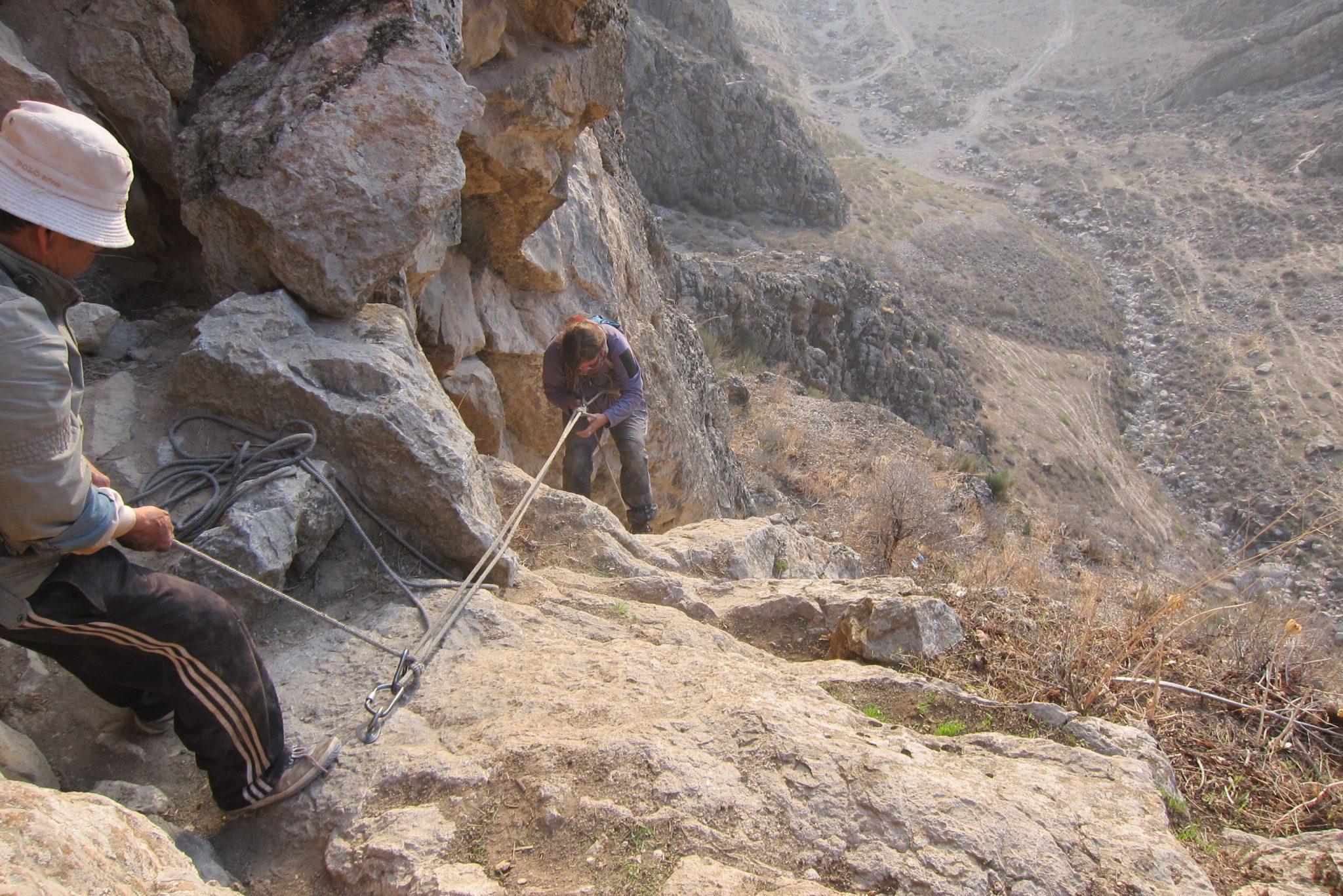 We pack, and grab a taxi for a half an hour ride to the bottom of the hill, where the path to the caves begins. There we meet a handful of locals who try to convince us that it’s way too late to go up today. But today’s all we’ve got! And, yes, a guide is necessary. I’m not a big fan of guides, so I ask if we can possibly make it to the caves ourselves. “Got ropes?” Of course, we don’t. One man shakes his head and says it would be foolish to go alone. He gives us a phone number, and we arrange a guide to arrive in 15 minutes! All of us have traveled the Stans long enough not to take this timeframe seriously, so we ask for tea and light snacks as we wait.