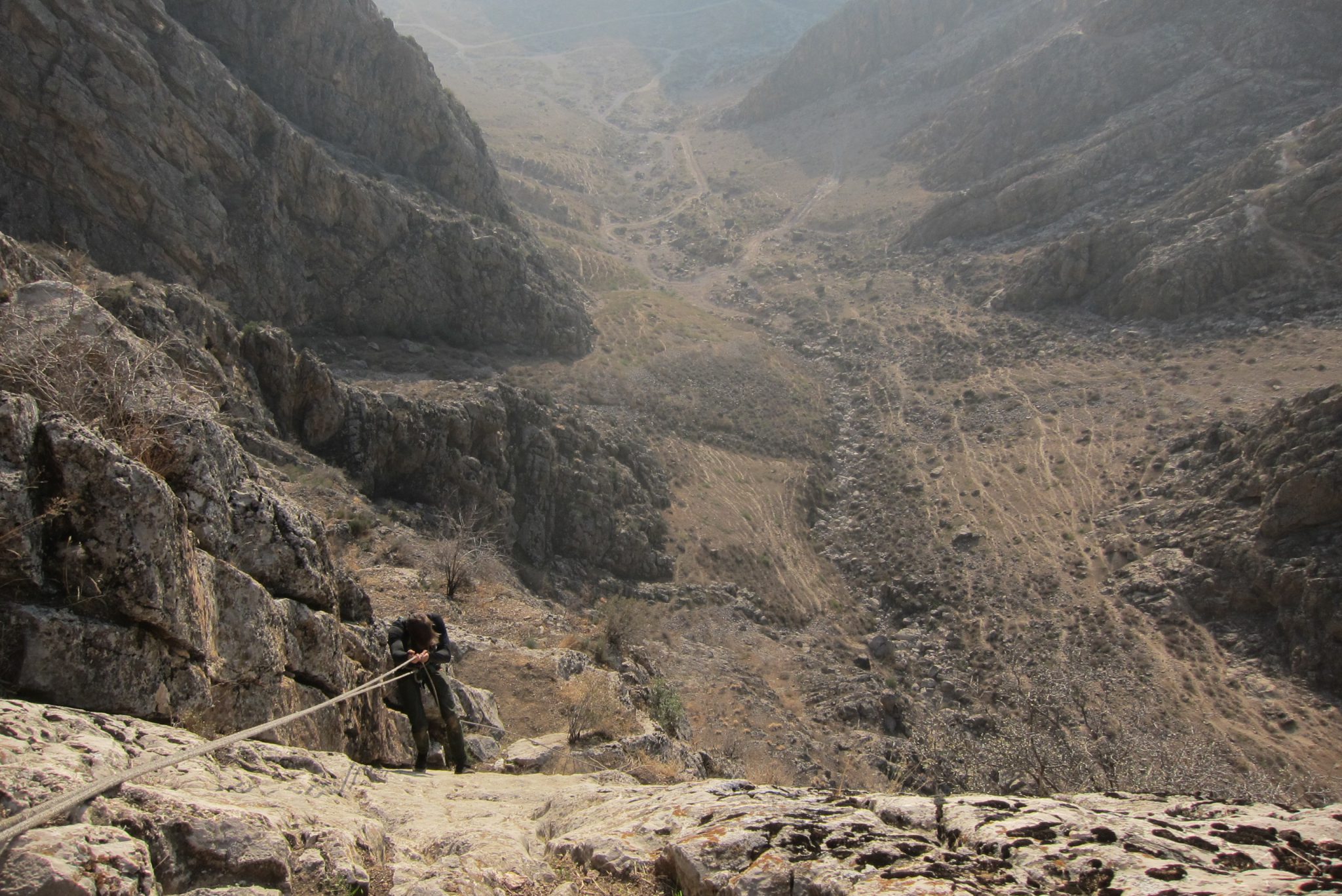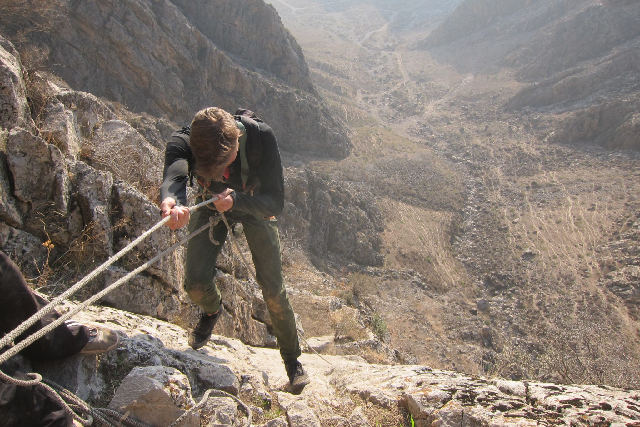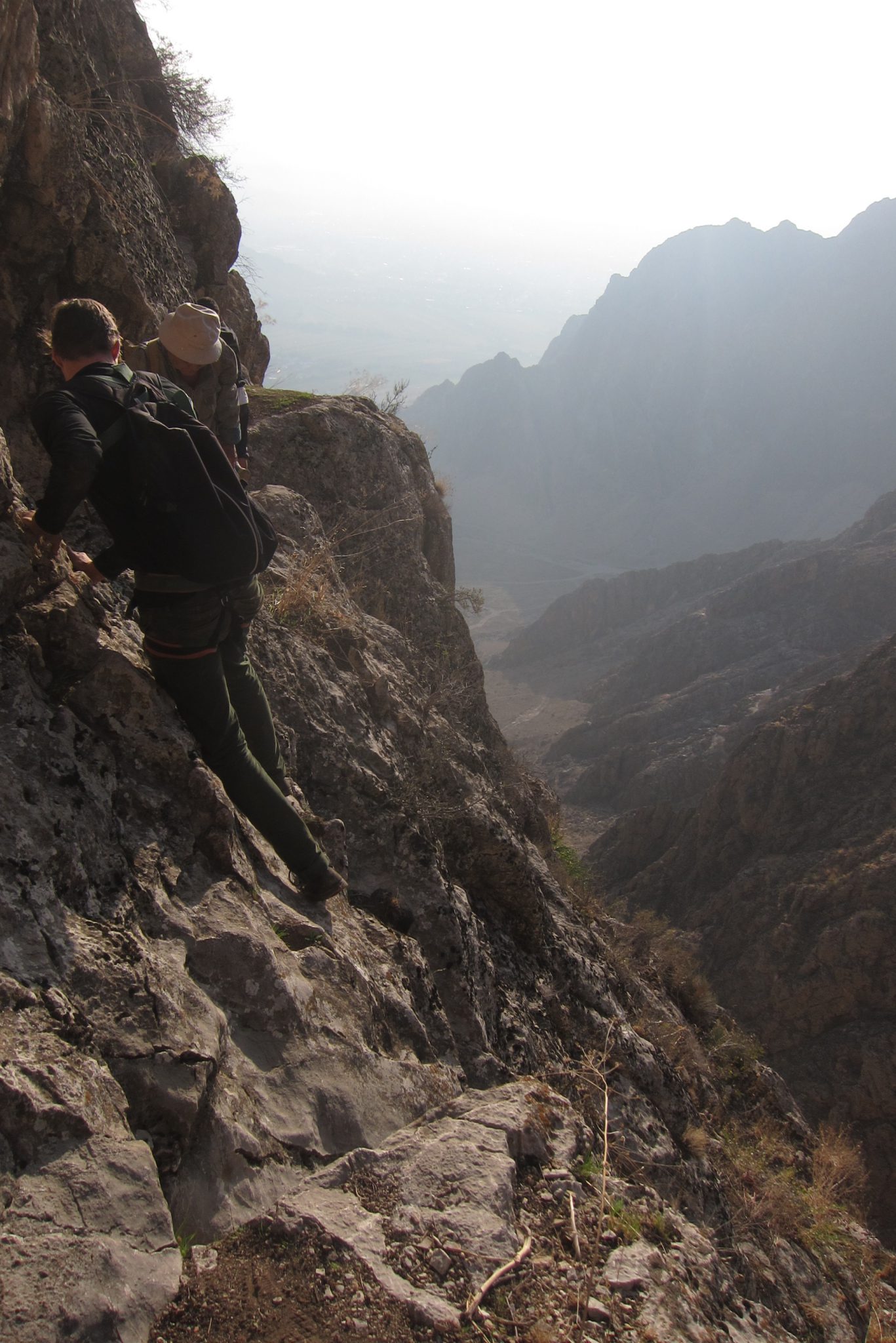 Next stage. A narrow path runs by the cliff, and underneath it – not really an abyss – but if you fall, serious injury or forced repatriation guaranteed. Periodically the path disappears altogether, and a few cracks in the rock are all you have to move forward. Danila shows us every single move. We have no security ropes here – only our own agility.