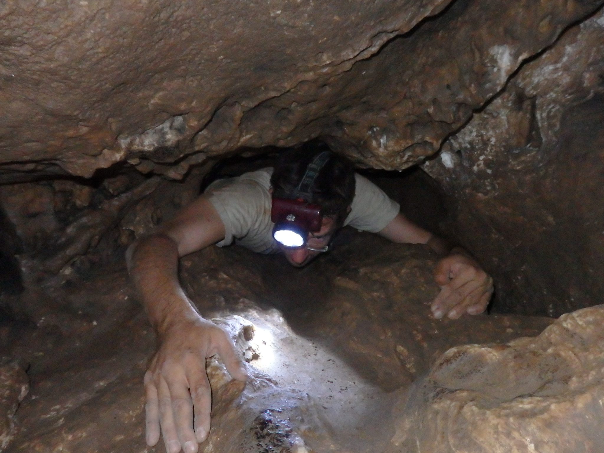 We approach wall number two. It’s somewhat lower, but smother and steeper. Another superhuman moment, but I get over it. Finally, we’re at the cave. Danila removes the metal plate covering the entrance, hands out our headlamps, and we go in. Initially it’s a cave like any other – pretty entrance hall that gets more and more narrow until you’re crawling on your stomach and eventually reach something I’d call The Tight Place.
