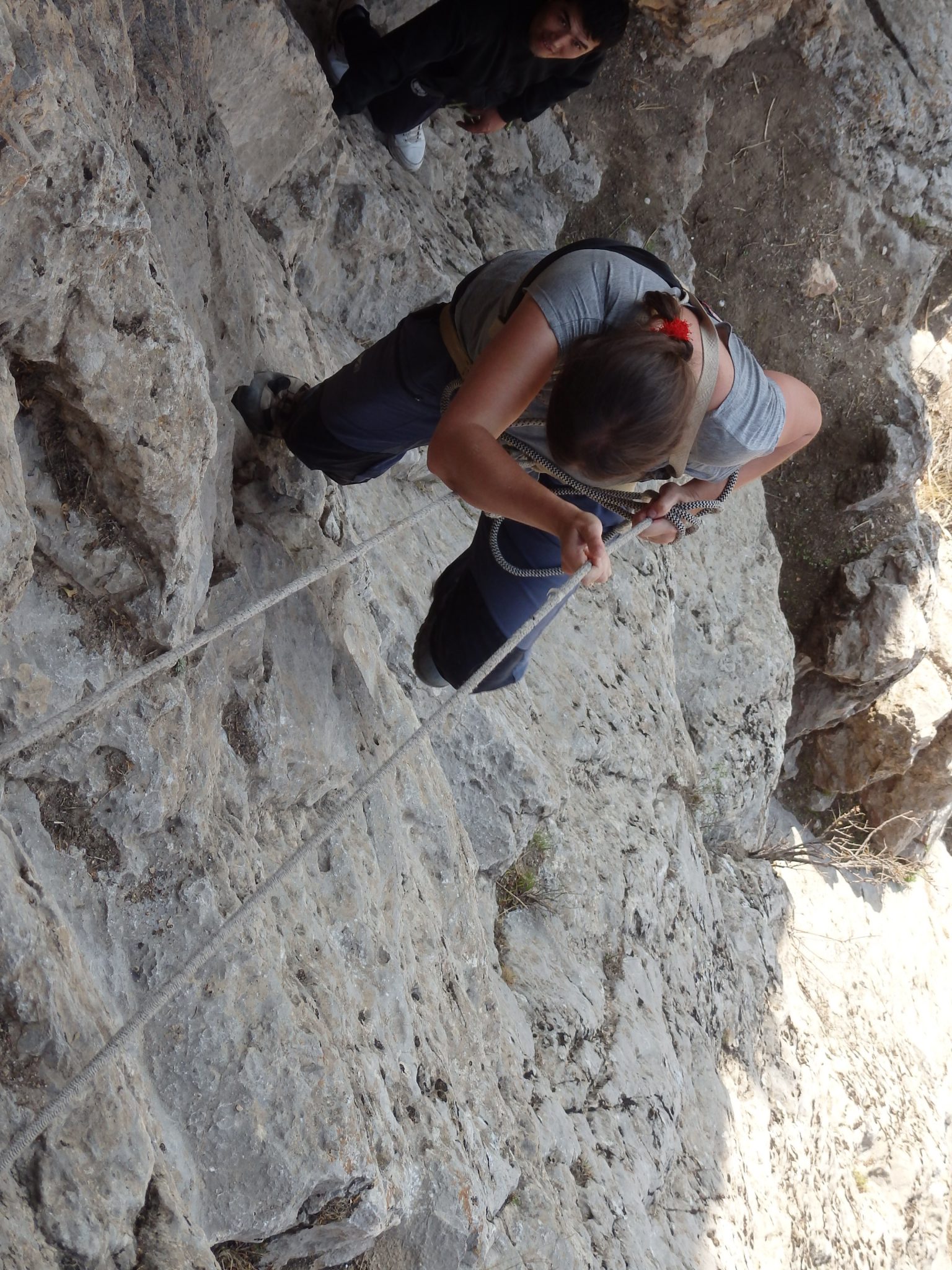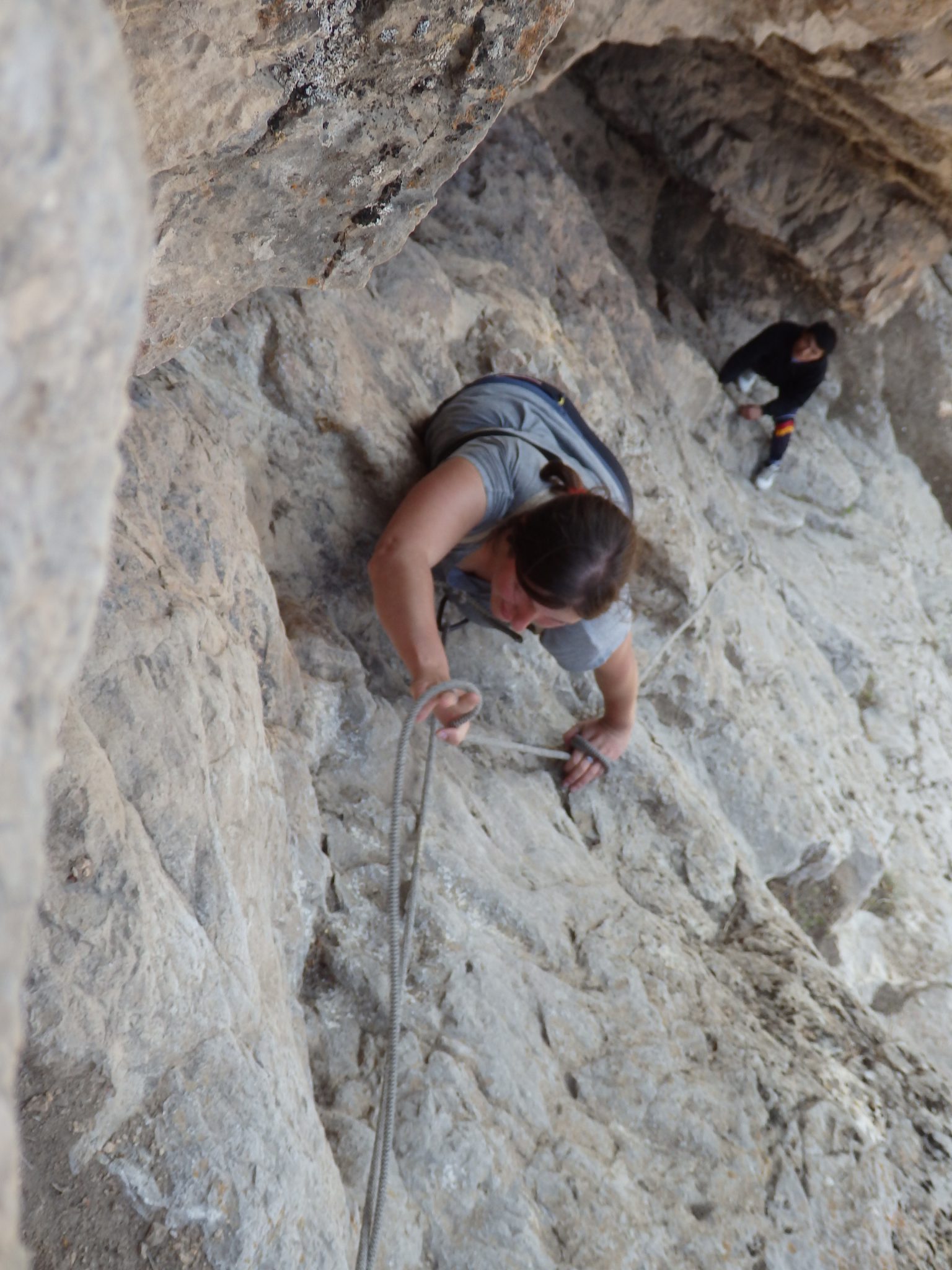 After a while of crawling like that, Danila asks everyone to get their gear. And points to a steep wall: “We’ll climb there”. Whaaat? No, no we won’t! I won’t! It’s practically vertical! I’ve never climbed in my life. I’m already tired from the way here. I’m too clumsy/weak to do it. I have to theoretical, much less practical knowledge in rock climbing. These and ten other thoughts rush through my head, some of them escaping through my lips.